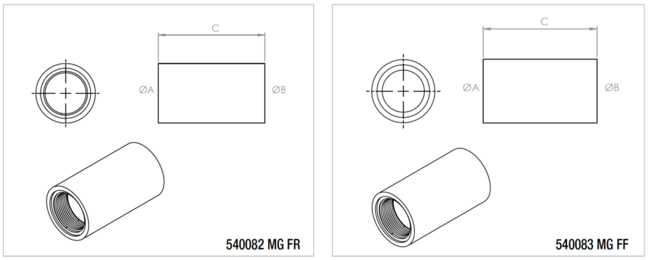 - Manicotto “MG FF”: utilizzato per collegare la parte femmina alla parte maschio del tubo corrugato, fornito completo di 4 guarnizioni O-Ring.