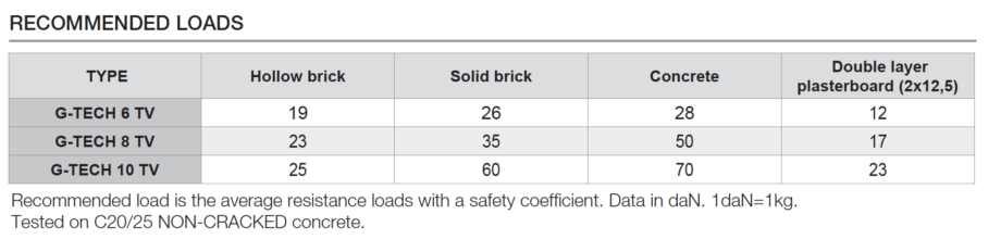 | 131830 | G-TECH 8 TV | Masonry, non-cracked concrete, double layer plasterboard | Aggiungi / Rimuovi |