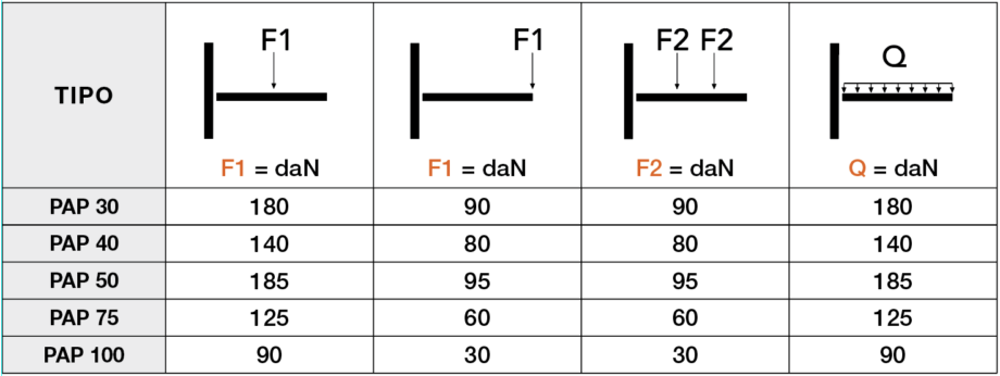 F=carico concentrato in daN - Q=carico uniformemente distribuito in daN - Tensione ammissibile 140N/mm2 - Freccia ammissibile L/125 - Per il fissaggio a muro attenersi alle caratteristiche di tenuta del tassello o del supporto di raccordo.